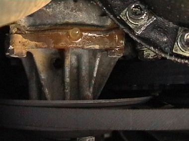 Auch die Technik ist nicht perfekt - Trommelbremsen hinten scheinen etwas lau zu sein, die Kaltstartautomatik am Vergaser wurde abgeklemmt, die Ventile müßten eingestellt werden und derzeit verliere ich etwas viel Kühlwaser an der Wasserpumpe - vielleicht nur eine defekte Dichtung!?! (siehe Bild - Wasserpumpe mit Keilriemen von unten gesehen) - Nachtrag: wurde komplett ersetzt - siehe weiter unten...